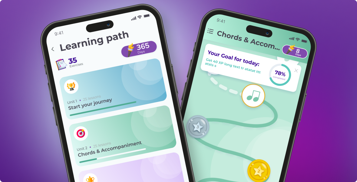Progress in music is never linear. Sometimes it may feel like you’ve hit a plateau, but that’s not the case, every focused minute you spend practicing moves you forward. To make progress more visible and motivating, the app uses gamification, a clear sense of achievement, a personalized virtual teacher, and social features like learning with friends, making the learning process more engaging and immersive.